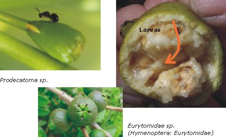 Os galhadores é o mais importante grupo de insetos associados e candidatos ao controle biológico do araçazeiro. As espécies de destaque são: Tectococcus ovatus Hempel, 1900 (Heteroptera:Eriococcidae), Dasineura gigantea Ângelo & Maia, 1999 (Diptera:Cecidomyiidae), Neotrioza tavarezi Cawford, 1925 (Hemiptera: Psyllidae), Eurytoma sp., Prodecatoma carpophaga Dalmolin, Melo & Perioto,2004 (Hymenoptera:Eurytomidae). Há mais duas espécies de Eurytomidae que necessitam ser descrita.